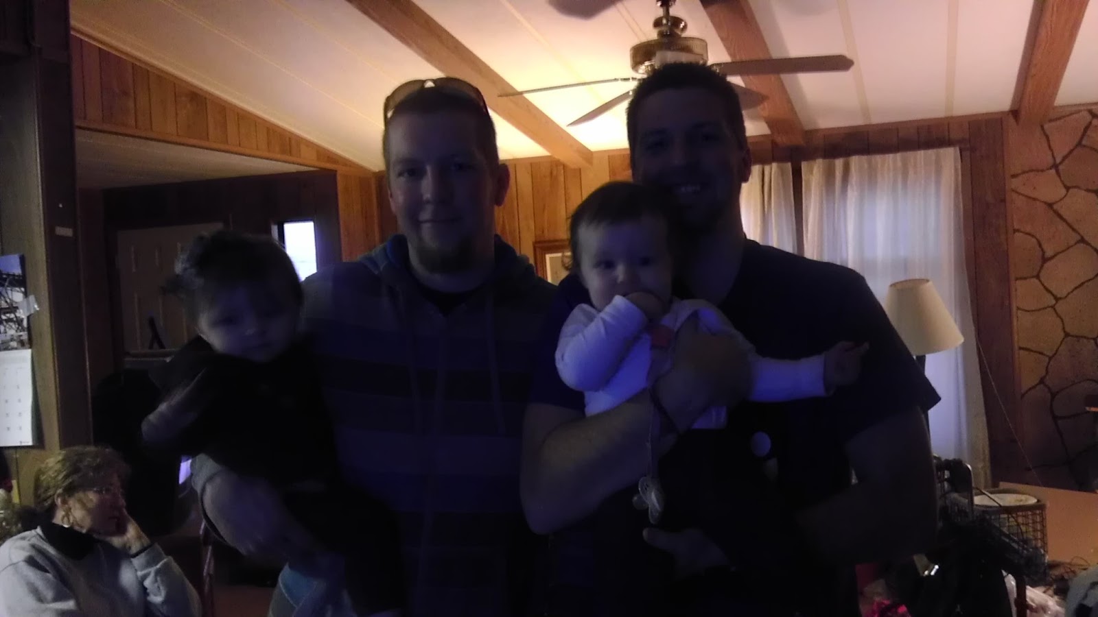 Dinner up at Grandma and Grandpa Coons! Everette and Eli holding each other's babies!! Remi and Chloers!